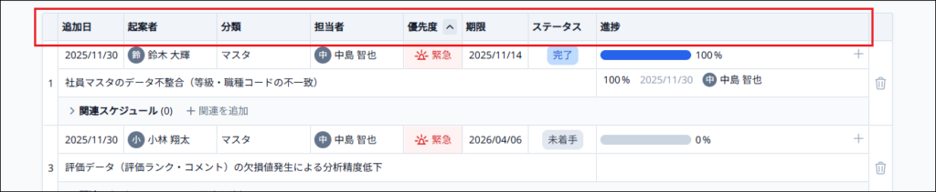 課題管理表の赤枠の項目ごとにソートができるようになりました。