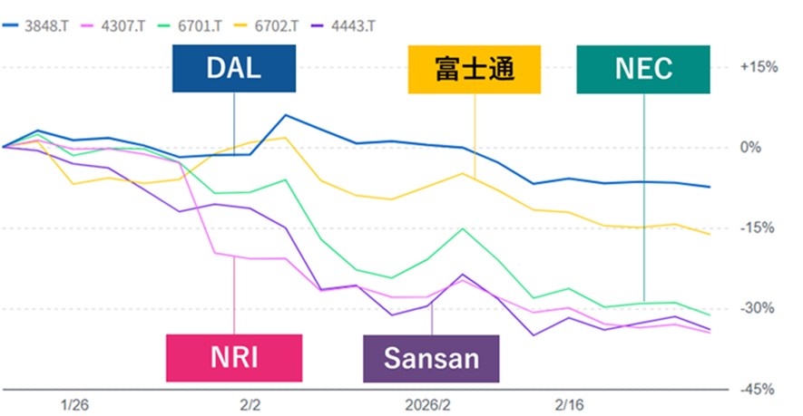 日本でも同様の空気が漂い始めています。このコラム執筆を始めた2026年2月21日時点での国内IT企業の株価動向を調べてみると、日本電気(東証PRM)、野村総合研究所(東証PRM)、Sansan(東証PRM)は1カ月で30%以上も時価総額が下落していました。