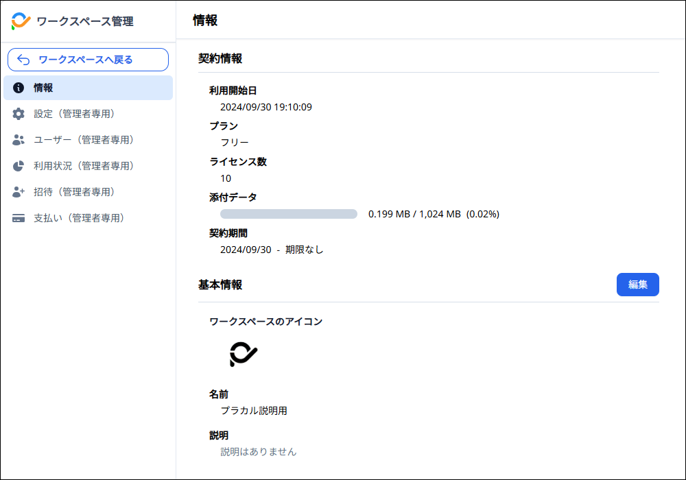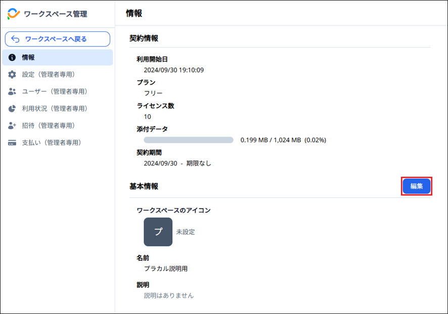 3)ワークスペース管理の「情報」画面で、基本情報の「編集」をクリックします。