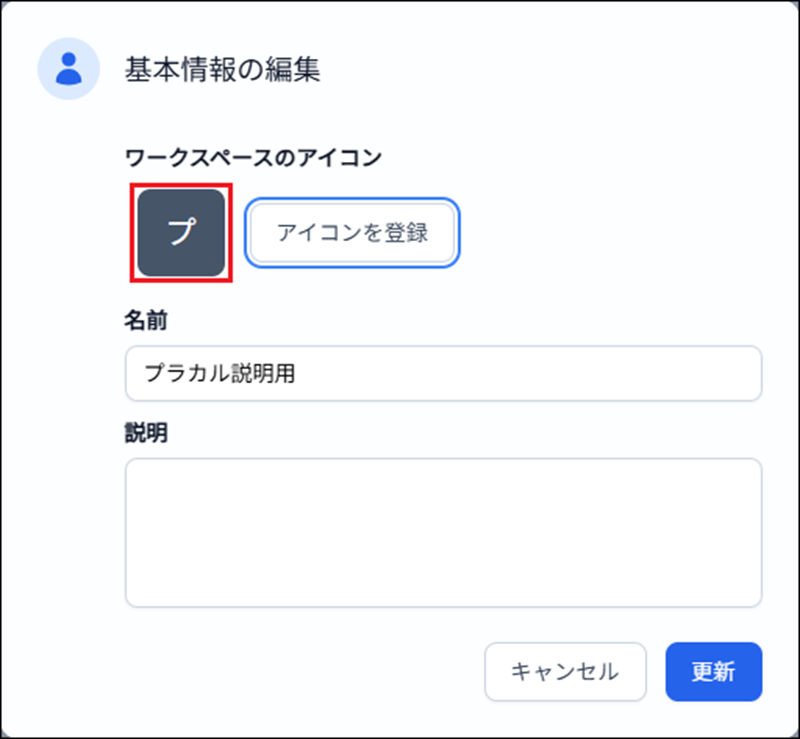 1) ワークスペースのアイコン画像(赤枠)、または 「アイコンを登録」 をクリックします。